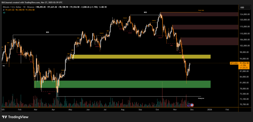 Bitcoin surged back above $91,000, reclaiming a critical support area after last week’s heavy sell-off. Market structure on the daily chart shows a decisive reaction from the $80,000–$83,000 demand zone, where buyers stepped in aggressively, pushing the price into a short-term recovery phase.