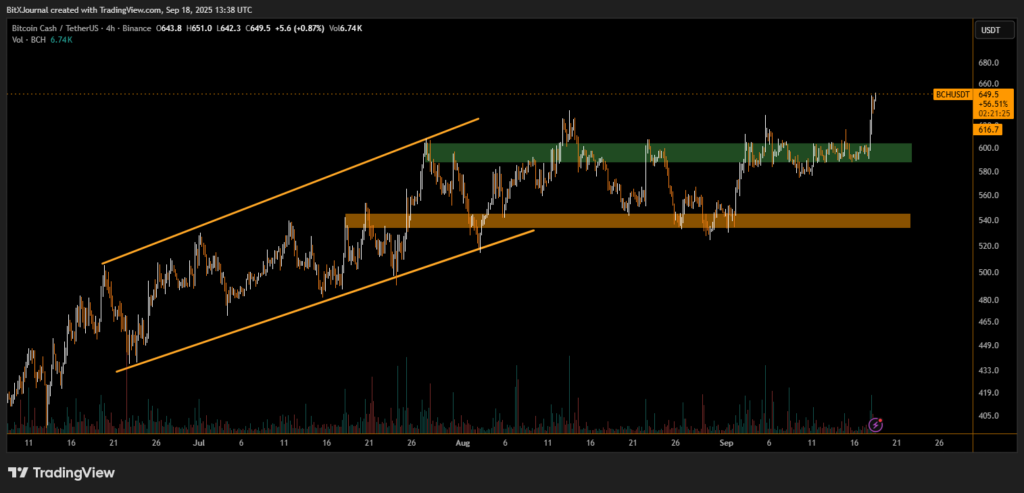 On the 4-hour chart, BCH surged past the $616 support zone, which had acted as a critical base for weeks. With strong momentum, the cryptocurrency is now testing the $650 resistance level, an area that will determine whether bulls can extend the rally.