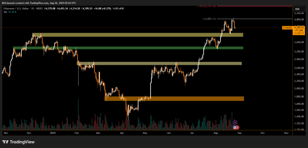 - Ethereum (ETH) is holding better, trading at $4,394, down slightly to $4,340, still above last week’s low.