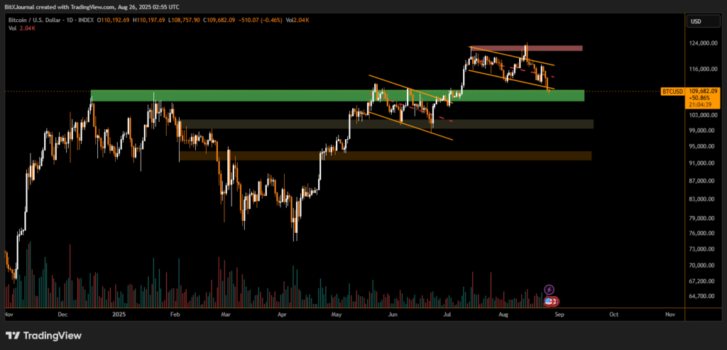 Bitcoin has now corrected 12% since its recent all-time high of $124,000 on Aug. 14, and is down 7% since Jerome Powell’s speech, where he hinted at potential rate cuts. At press time, BTC trades near $109,534, its lowest price since July 9.
