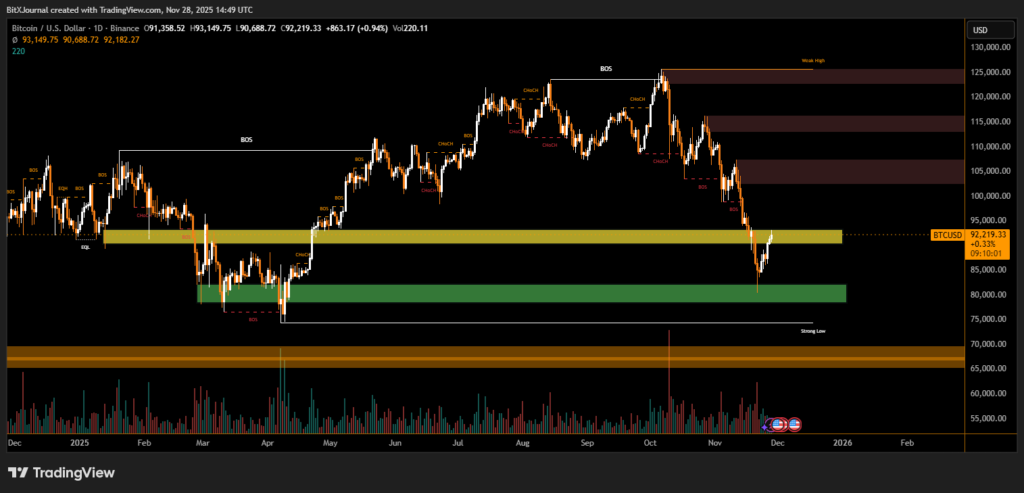 Bitcoin’s move toward $93K places it at a pivotal technical juncture. The reaction in the current supply zone will determine whether the recent bounce evolves into a sustained recovery or fades into another bearish continuation. With multiple liquidity pools and price imbalances above and below, the coming days are set to provide clearer direction for the next major BTC trend leg.
