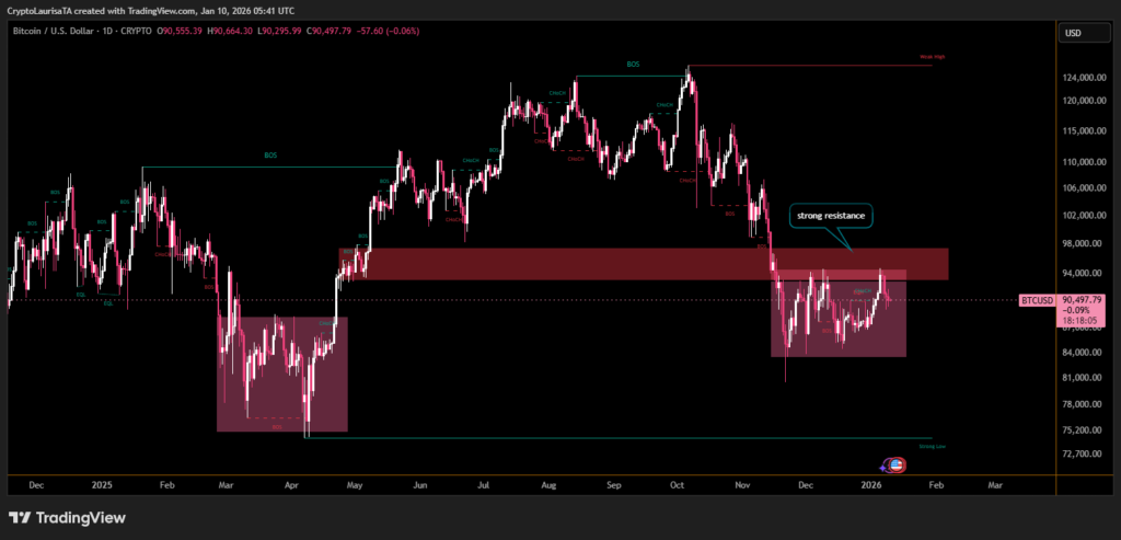 Bitcoin reached a weekly high above $94,000 before pulling back toward $90,000, where buying support appeared to hold. This stabilization came as US spot Bitcoin ETFs recorded consecutive net outflows, following strong inflows at the start of the year. After more than $1 billion entered ETFs in early January, sentiment cooled, with several hundred million dollars exiting over subsequent sessions.