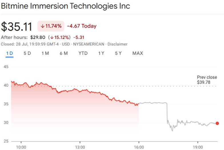 A slide shared by the firm projected Ethereum’s “implied value” at $60,000, citing unnamed research. But instead of boosting confidence, BMNR shares dropped 11% during the trading day and another 15% in after-hours, closing at $35.11 from a peak of $135 earlier in July.