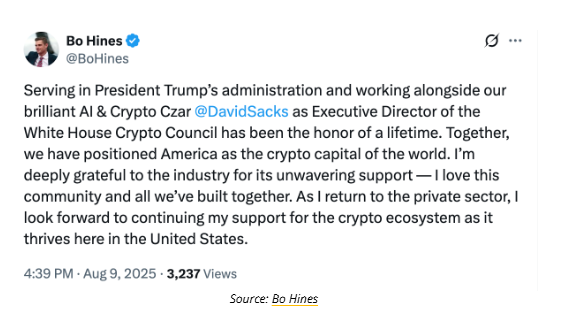 In a significant leadership shift for U.S. cryptocurrency policy, Bo Hines has stepped down as executive director of the White House Crypto Council, citing plans to return to the private sector. Hines, appointed in late 2024, played a central role in shaping the administration’s approach to digital asset regulation and the creation of a strategic Bitcoin reserve.
