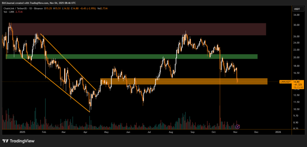 Chainlink’s native token slipped more than 13%, marking one of its sharpest single-session declines in recent weeks as broader risk sentiment weakened across digital assets. The drop forced LINK below an important structural support zone near the mid-$15 range, bringing the asset back to levels last seen shortly after the early-October liquidation event.