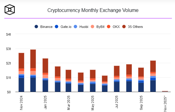 Binance led the pack with $810.4 billion in monthly volume, followed by Gate ($175.6 billion), Bybit ($156.9 billion), and Bitget ($134.7 billion).