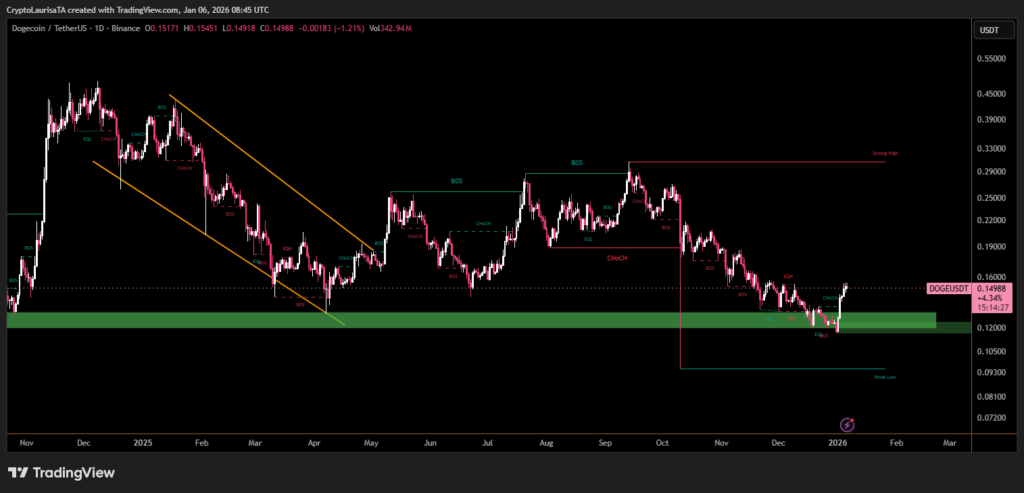 DOGE’s price action has formed a V-shaped recovery pattern, a structure often associated with aggressive dip buying. Analysts highlight $0.1513 as a key support level, with sustained trading above this zone viewed as critical for further upside momentum.