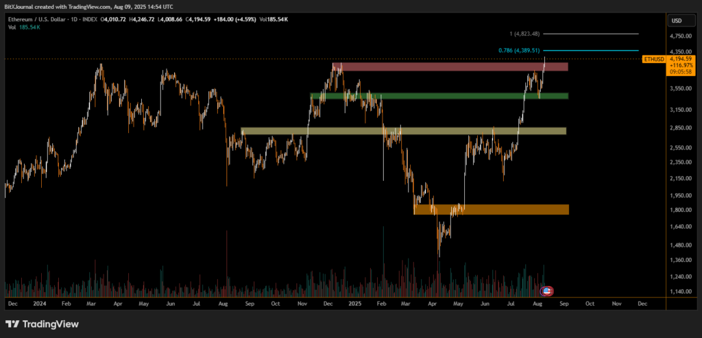 Ethereum (ETH) has entered a high-stakes zone after breaking through the $4,000 psychological barrier, now trading near $4,194 at press time. A strong upward move has pushed ETH into a key supply zone, and market watchers are closely eyeing the Fibonacci 0.786 level at $4,389 as the next likely resistance.