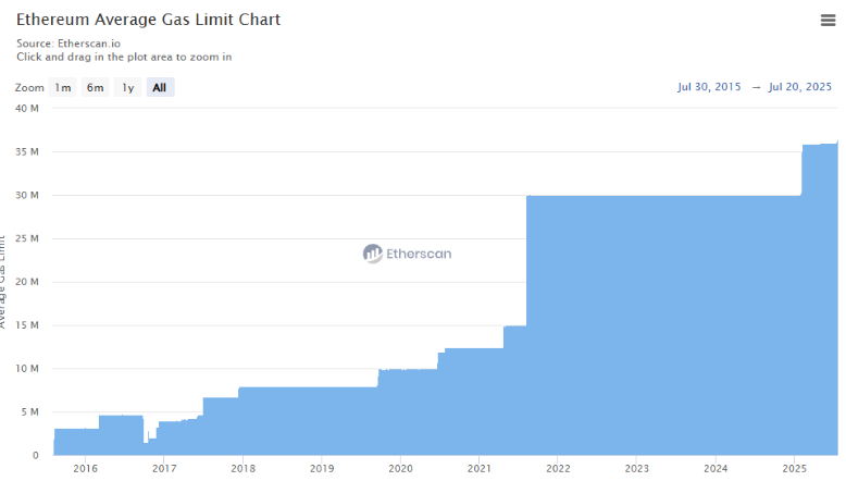 Ethereum is entering a new phase of layer-1 scalability, with its gas limit crossing 37.3 million units, according to Etherscan data from July 21. The move reflects growing validator support to raise the cap further to 45 million, which would reduce transaction costs and improve on-chain capacity.