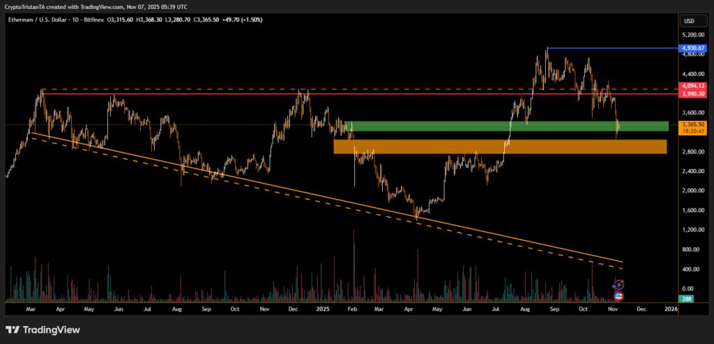 At the time of writing, ETH traded around $3,323, having fluctuated between $3,251 and $3,451 over the past 24 hours, according to CoinGecko data.