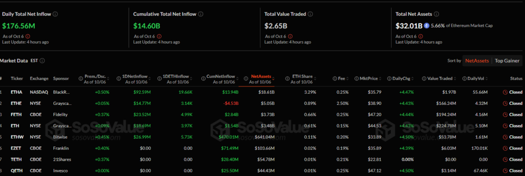 The surge has been supported by steady ETF inflows over the past few months. Data from SoSoValue shows that U.S. spot Ether ETFs recorded $621.4 million in net inflows in October, up sharply from $285.7 million in September and $3.9 billion in August, underscoring growing investor appetite.