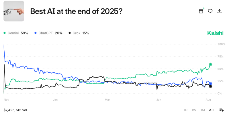 The Kalshi prediction market will resolve on December 31, 2025, based on outcomes verified by the LM Arena Leaderboard. So far, $7.4 million in volume has flowed into this single betting scenario.