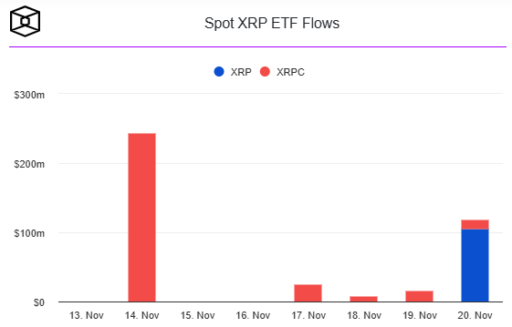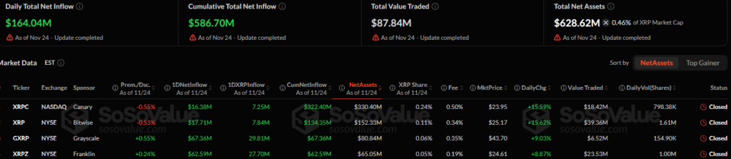 Additional flows into Canary Capital’s XRPC and Bitwise’s XRP fund added to the momentum, bringing the total category inflows to $164.1 million on Monday. Since their launch on Nov. 13, spot XRP ETFs have accumulated $586.8 million in net inflows without a single day of outflows.