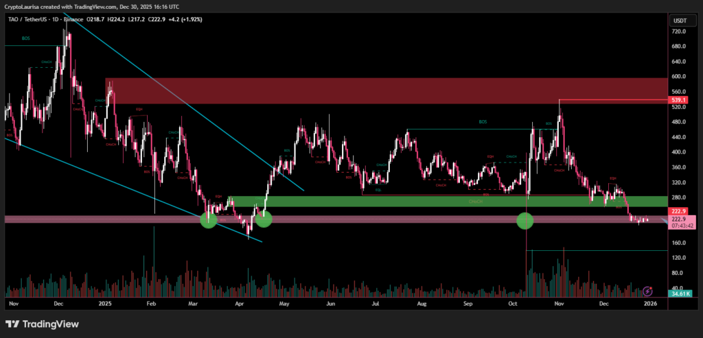 Bittensor’s halving, which occurred in mid-December, reduced new TAO issuance, mirroring the supply-cut mechanics seen in bitcoin’s halving cycles. While TAO’s price dipped immediately after the event, it has since stabilized near $222, suggesting the market is adjusting to the new supply dynamics.