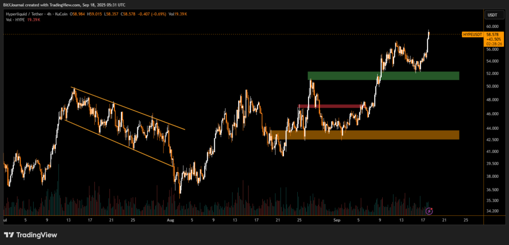 Hyperliquid’s native token HYPE surged to an all-time high this week, underscoring the growing momentum in decentralized derivatives exchanges. The token closed near $60 after an 8% daily gain, briefly touching $59.29 in early trading. With a market capitalization just shy of $16 billion, HYPE has climbed almost 40% over the past month, far outpacing major cryptocurrencies such as Bitcoin, Ether, and XRP.
