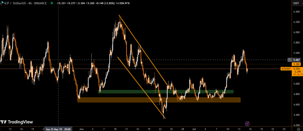 As of 16:35 UTC on July 14, ICP is trading between $5.44 and $5.46, entering a tight consolidation range after the rapid retracement. The market is currently digesting the volatility, with both buyers and sellers waiting for directional confirmation.