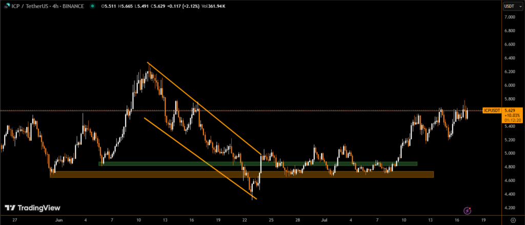 Over the 24-hour period between July 15 at 15:00 UTC and July 16 at 14:00 UTC, ICP gained 7%, fueled by increased interest in altcoins as Bitcoin and Ethereum led a fresh market-wide breakout. The price action saw ICP peak at $5.66 before entering a tight consolidation range.
