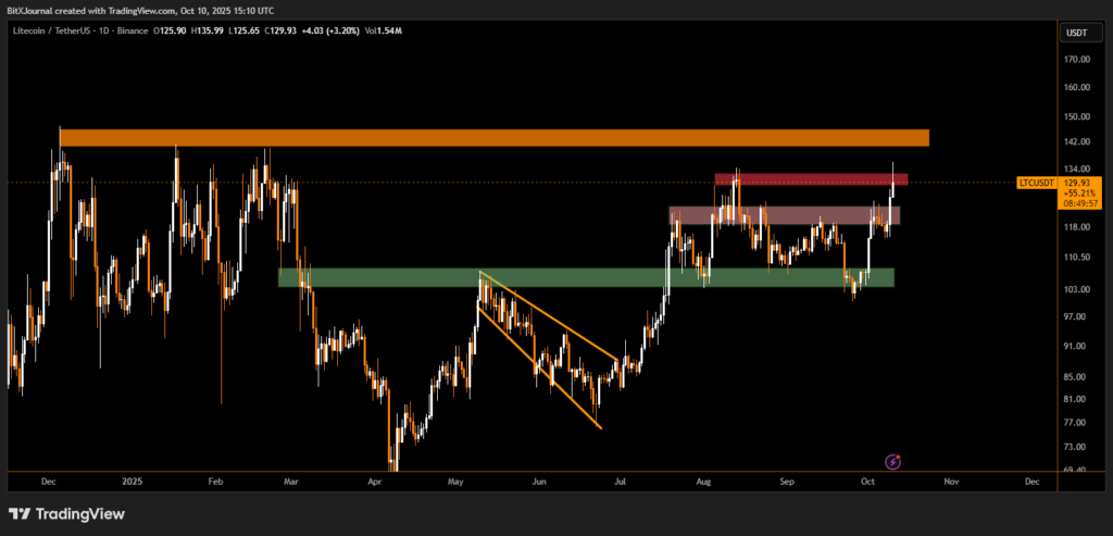 Litecoin (LTC) posted a 12% surge in the last 24 hours, breaking above key technical levels as bullish momentum returned across the altcoin market. The rally has pushed the cryptocurrency to around $132, marking one of its strongest daily performances in months.