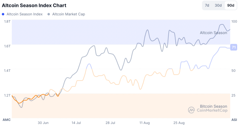 Analysts at Bitfinex argue that altcoins may not see major rallies until ETFs that track higher-risk digital assets gain approval. The Altcoin Season Index recently hit its highest level in 90 days, reflecting increased speculative interest.
