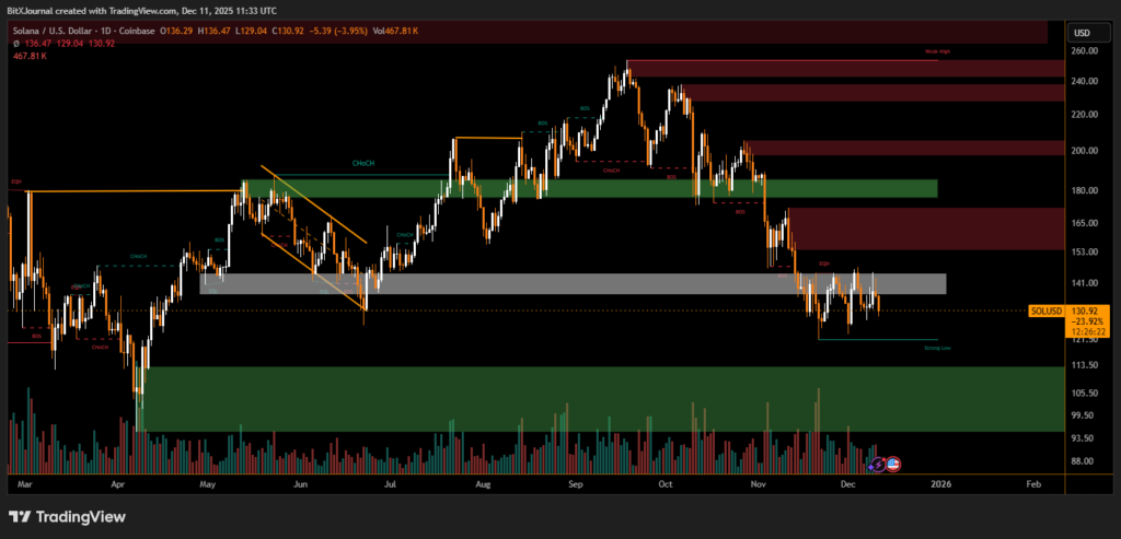 Current price action shows Solana trading within a compressed band just below a critical supply region that has repeatedly rejected upward attempts. The market highlights a series of break-of-structure signals, reinforcing the broader downtrend that has persisted through the final quarter of the year.