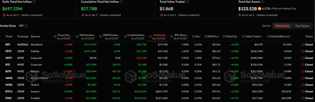 On Monday, U.S. spot Bitcoin ETFs reported $697.25 million in net inflows, marking the largest daily total since early October. Combined with $471.14 million in inflows last Friday, total ETF inflows for the first two trading days of 2026 exceeded $1.16 billion, according to market data.