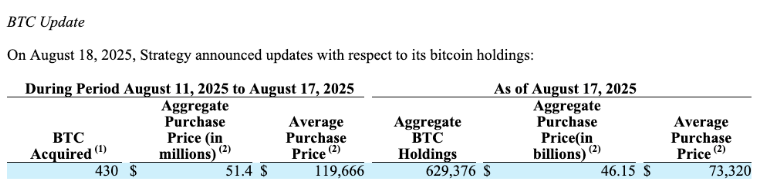 Michael Saylor’s Strategy, already the largest publicly traded holder of Bitcoin, increased its stash by 430 BTC last week. According to a filing with the U.S. Securities and Exchange Commission (SEC), the purchase was made at an average price of $119,666 per coin, totaling $51.4 million.