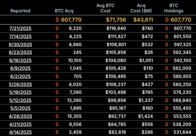 The latest U.S. SEC filing confirms Strategy made no Bitcoin acquisitions last week, following a similar skip during the first week of July. The only two buys this month occurred on: