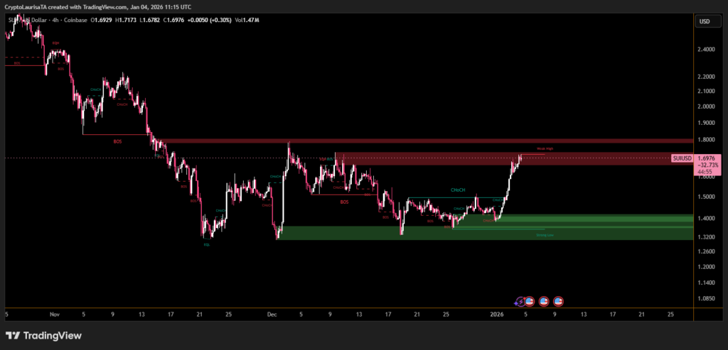 The rally was triggered after SUI rebounded decisively from the $1.32–$1.38 demand zone as a strong low on the 4-hour timeframe. A confirmed change of character followed by a break of structure signaled a short-term trend reversal. This technical shift coincided with improving sentiment across the altcoin sector, amplifying upside momentum.