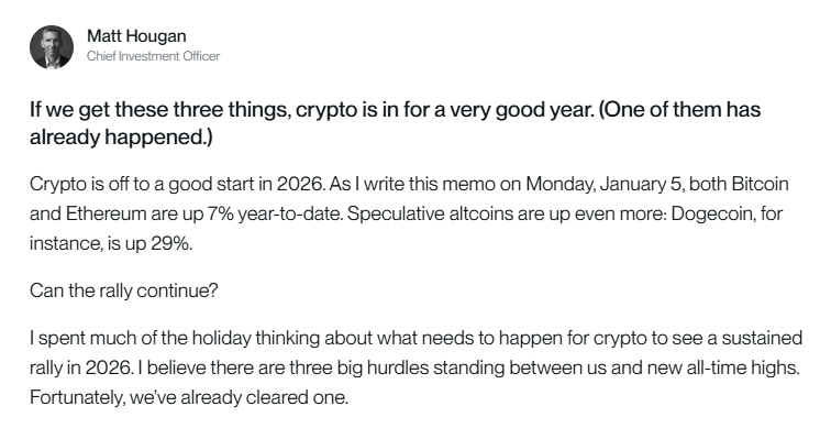 “Crypto is off to a good start in 2026,” Hougan said in a note on Tuesday;