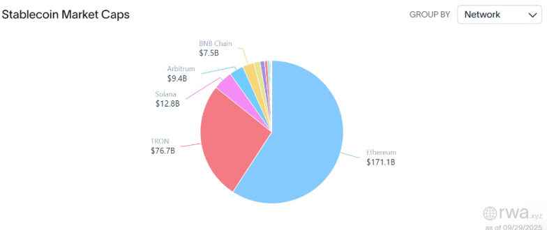 Stablecoin inflows rose by 324% quarter-over-quarter, with Ethereum remaining the dominant network, hosting $171 billion in circulating supply. Tron followed with $76 billion, while Solana, Arbitrum, and BNB Chain collectively held $29.7 billion.