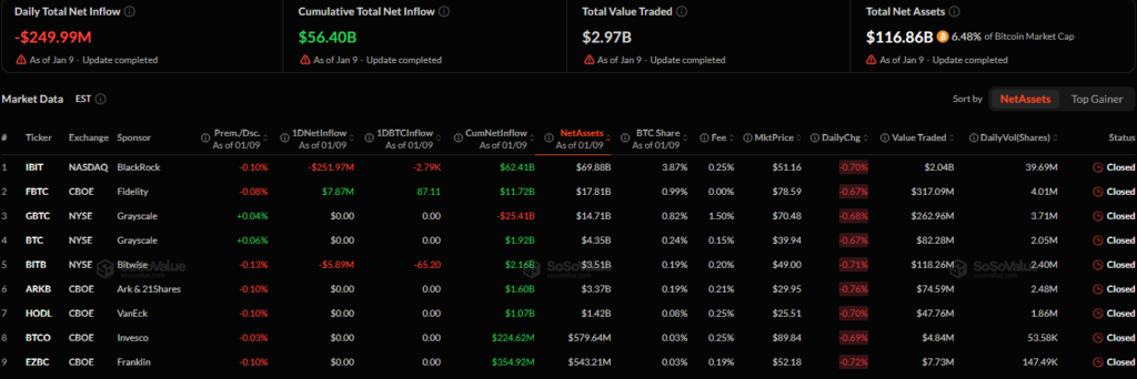 During the first full trading week of 2026, spot bitcoin ETFs posted $681 million in net outflows, marking four consecutive days of redemptions. The largest single-day withdrawal exceeded $486 million, reflecting heightened caution despite strong inflows earlier in the week. Total assets held by bitcoin ETFs now stand at $116.9 billion, representing 6.48% of bitcoin’s market capitalization.