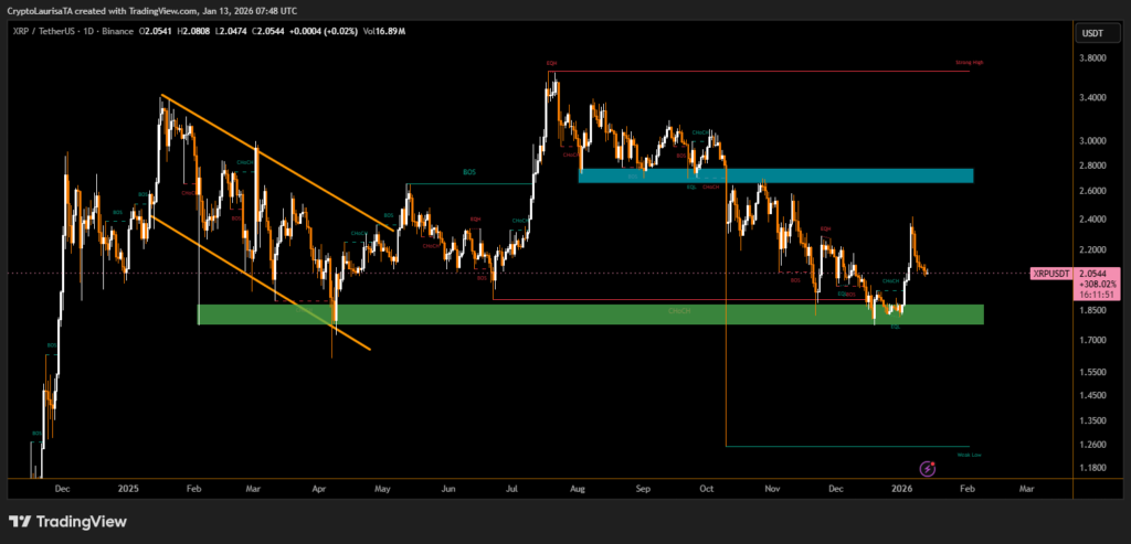 Despite brief buying pressure lifting XRP slightly, broader conviction remained mutedas the token struggled to break free from its multi-week consolidation. Resistance sits near $2.10 while support holds at $2.04, forming the current trading corridor. Bitcoin and Ethereum similarly faced momentum challenges, reinforcing a cautious environment across altcoins.