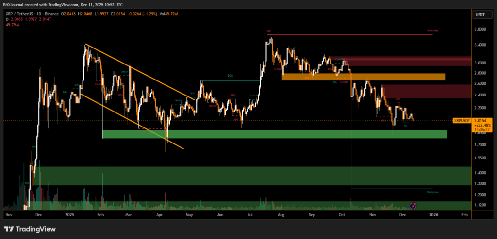 The markett shows XRP repeatedly failing to clear the $2.09–$2.10 resistance band, a level that has become a structural ceiling over the past several weeks. This zone aligns with prior break-of-structure levels and bearish order blocks, reinforcing its importance in the current market cycle. The consistent rejection reflects a market environment where sellers remain active even as broader liquidity conditions improve.
