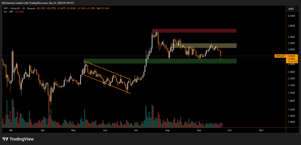 Below this, the next key defense lies near $2.30–$2.45, marked by high-volume demand during XRP’s June–July accumulation phase. A break under these levels could invite deeper retracement, while a recovery above $3.20 would reopen the path to the $3.75–$3.90 supply zone.