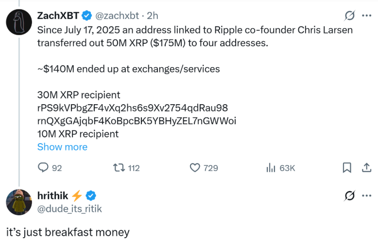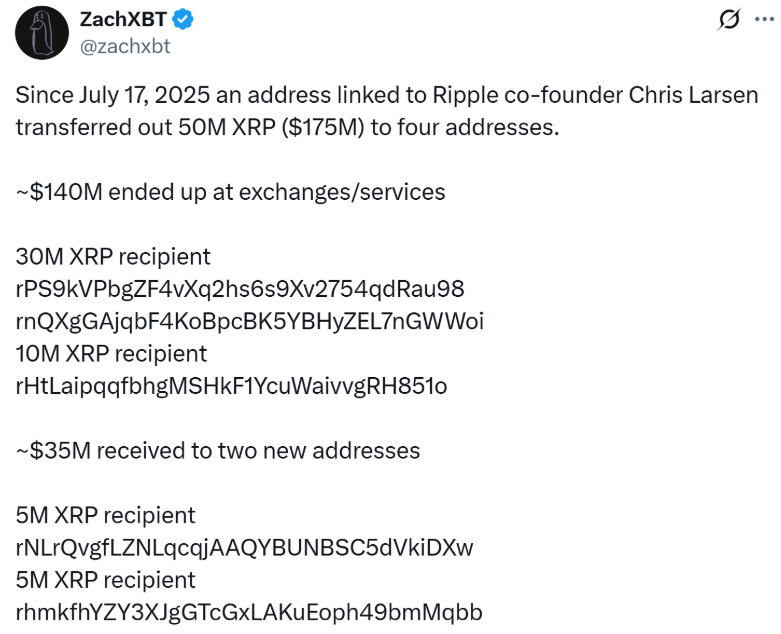 Blockchain investigator ZachXBT first flagged the movement on X (formerly Twitter), stating that approximately $140 million worth of XRP was sent to exchanges—a common precursor to selling. The timing couldn’t have been more controversial: Larsen’s transfer came just as XRP touched $3.60 on July 18, before tumbling to $3.09, prompting many in the community to accuse him of “dumping” on retail investors.